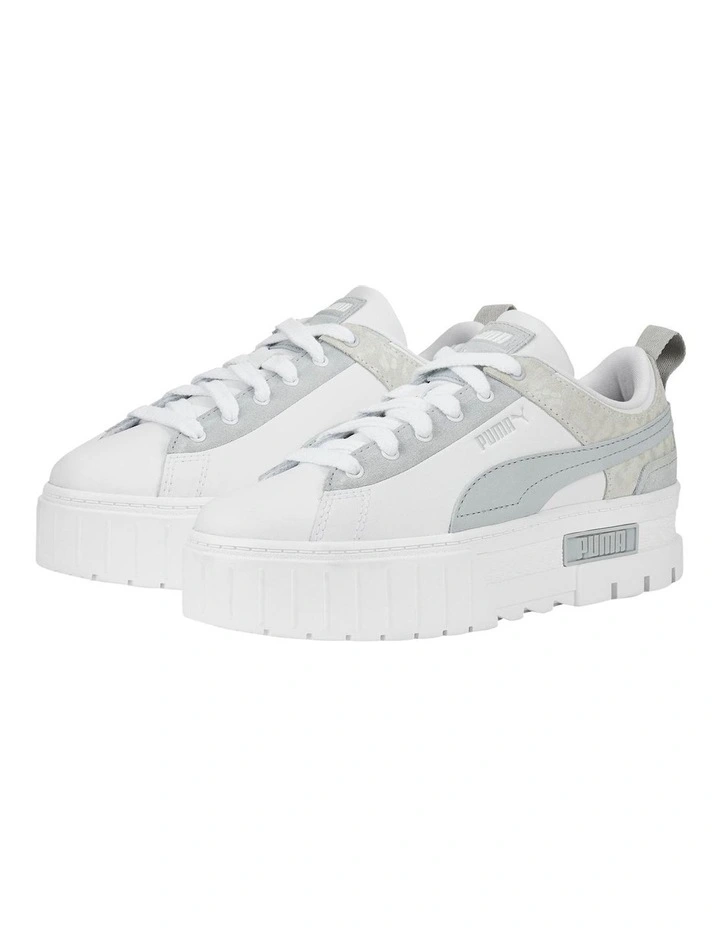Get ready to find your style in Mayze. We made this one for the hype girls, the street enthusiasts, the trend mavens. This stand-out silhouette takes design inspiration straight from the streets, with a stacked sole and contrasting rubber tooling for an edgy, layered look. This execution features a leather base, suede overlays and a foil animal print on the quarter panel.
