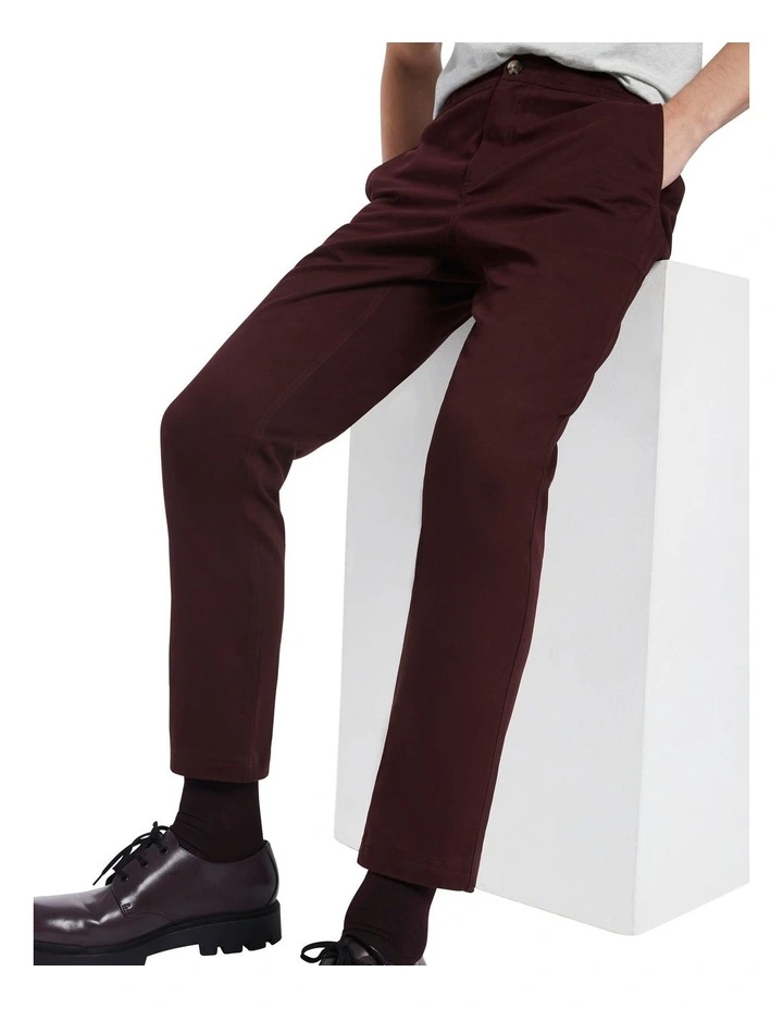 Revealing a rich merlot hue, these chinos show off a sueded look made from soft cotton twill, featuring just a hint of stretch for comfort and movement. Fastening at the front with a concealed fly and tortoiseshell button closure, the pants descend through tapered leg shaping to full length, finished with an elasticated back waistband, and pocketing front and back.