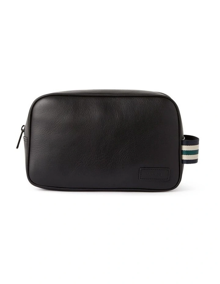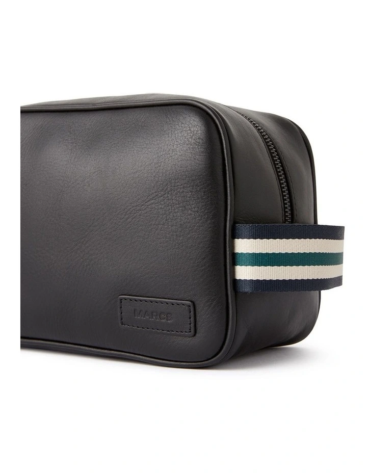 Perfectly sized and perfectly durable, this black leather washbag creates the perfect travel companion, featuring a large interior compartment with an internal zip pocket at the side. Measuring 24.7cm by 10.45cm by 15.2cm, the washbag is completed by a sturdy metal zip closure along the top, and a handy striped carry handle in Marcs colours at one end.