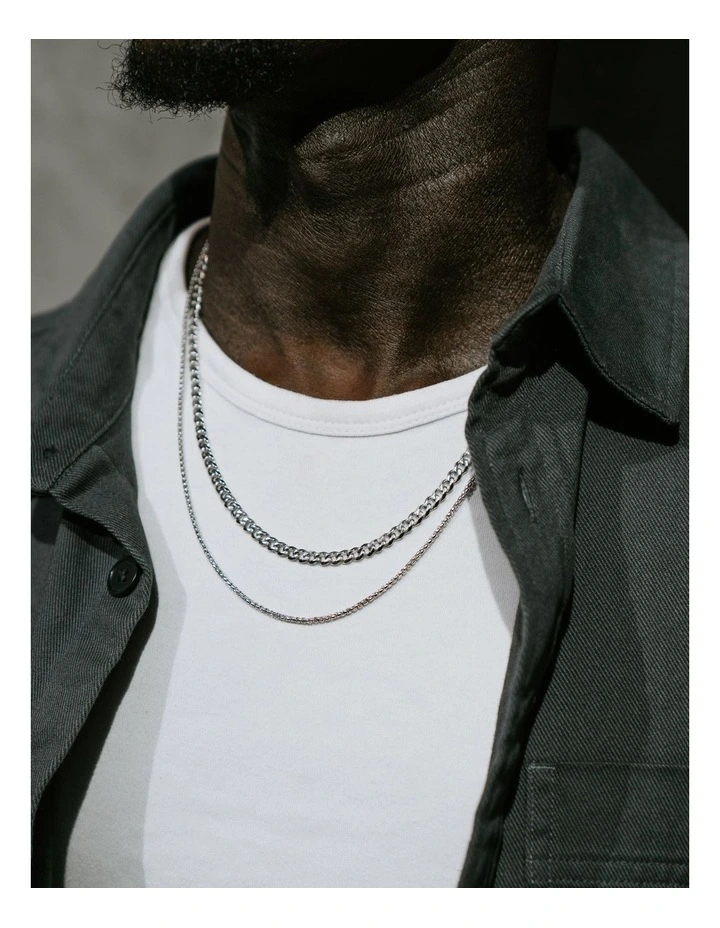 Introducing our best selling layered necklace set which includes our Josh Cuban 5mm Chain and Bruno 3mm box Chain in Silver. These similar chain link styles compliment each other perfectly and at a bundled discount they make for the perfect gift for yourself or someone else.
