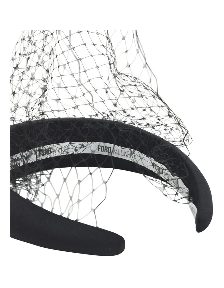 BLACK WIDOW by Ford Millinery is a chic padded headband featuring a birdcage veil in either black or white. BLACK WIDOW is the epitome of sophistication and elegance with the simple but affective veil. It fits comfortably on your head and instantly elevates your outfit to another level of style.