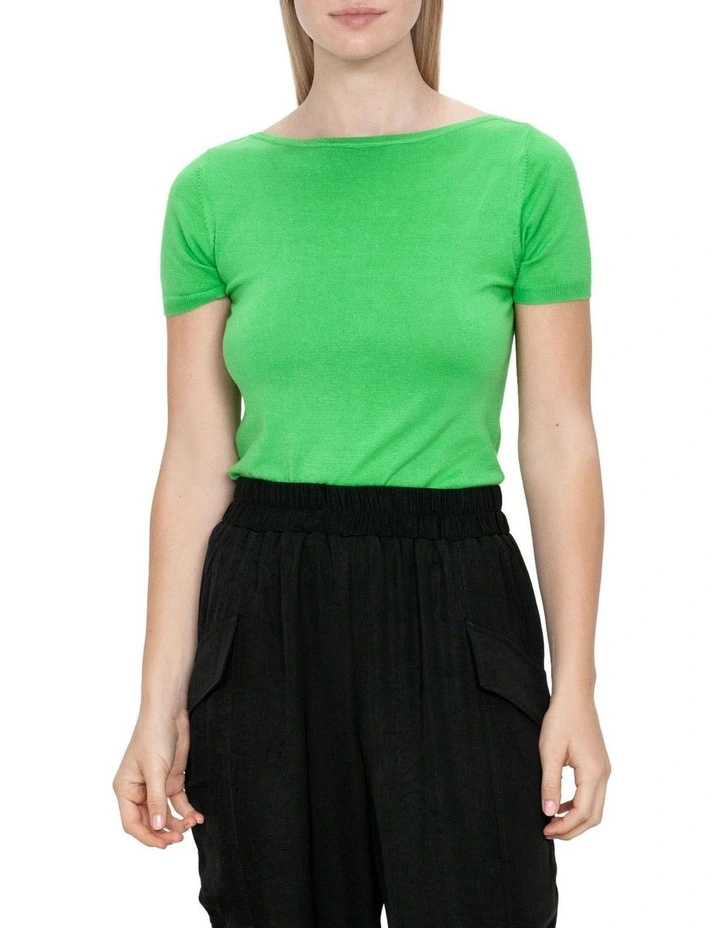 Crafted from our soft viscose nylon blend yarn, this knit top is a quintessential piece to have in your transeasonal wardrobe. This style features a modern slash neckline and short sleeves, making it the perfect everyday basic. Style back with tailored trousers for the perfect weekday look.