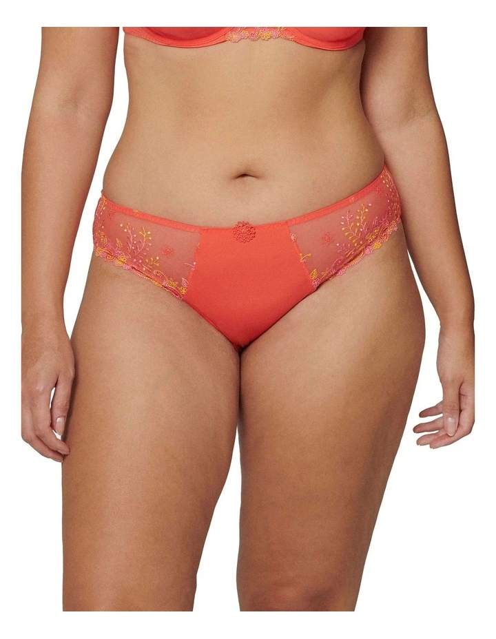 The Delice Bikini Brief, by Simone Perele, elevates the classic bikini cut with elegant Valencienne lace detailing and an embroidered motif on fine tulle.
