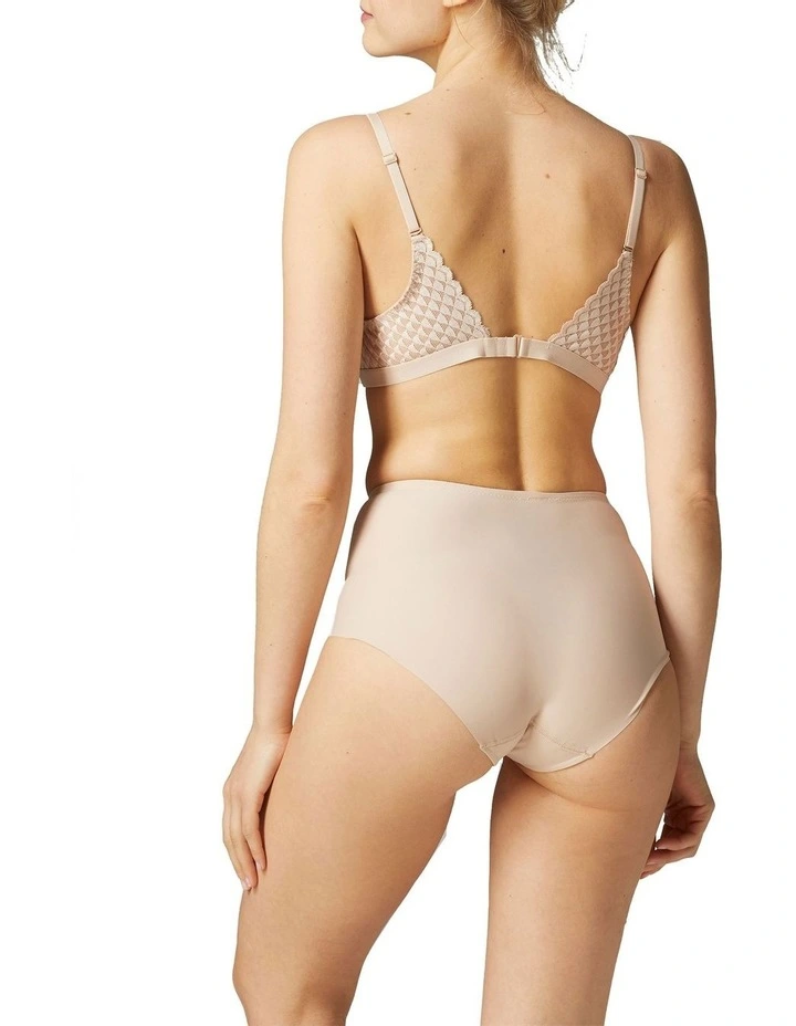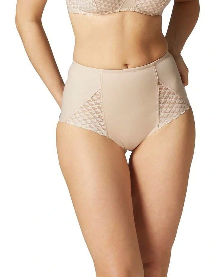 The Subtile High-Waisted Control Brief, by Simone Perele, uses control mesh, responsive knitted fabric and French lace to create body-shaping lingerie. Featuring tight-knit sculpting material against triangular laced slits at the hip, as well as clean-cut edging for a seamless look under clothing.