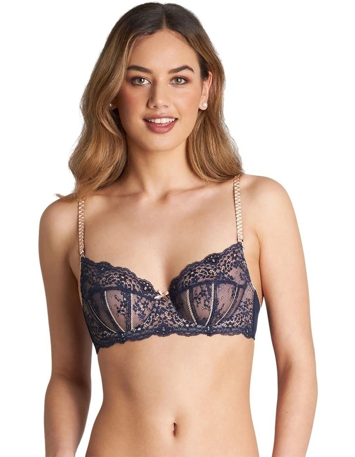 Sofia Underwire Bra in Peacoat colour with contrast linings and trims in Bellini is the answer to a classy, everyday look. Beautiful rigid lace and soft stretch mesh brought together to create the delicate shapes.