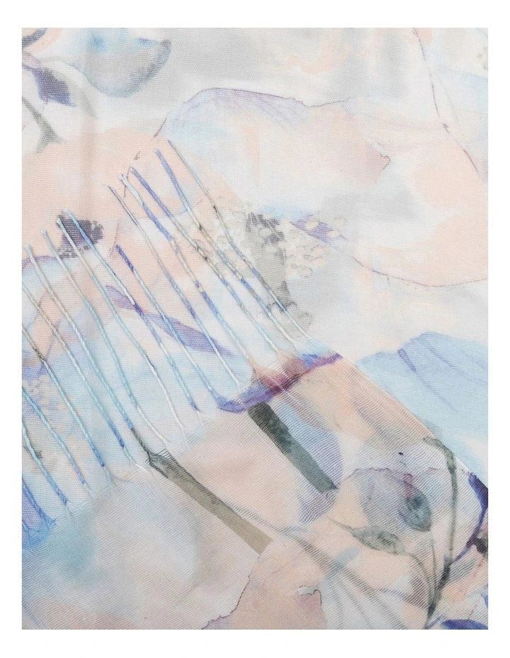 A soft blue and blush coloured scarf featuring a watercolour floral print.