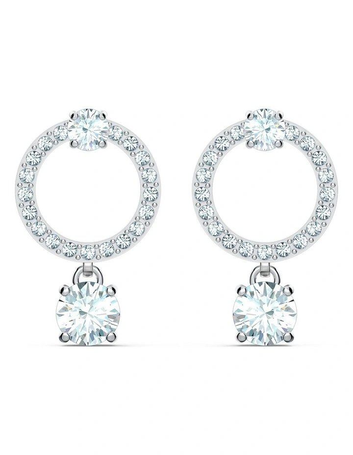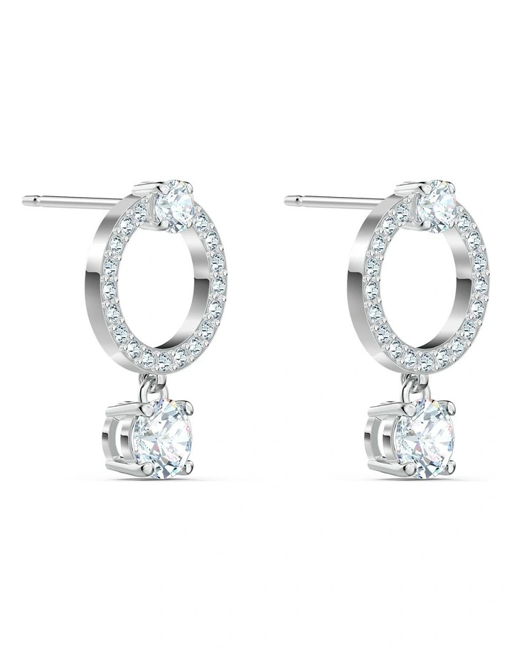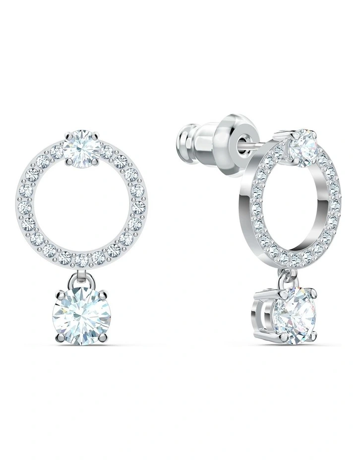 This pair of pierced earrings by Swarovski is simple yet brilliant. A round white stone dangles from a small hoop, the hoop itself beautifully embellished with sparkling pav. The dangling elements move whenever you turn your head, reflecting incoming light in ever new and brilliant ways. These attractive earrings add a unique sparkle to everyday outfits.