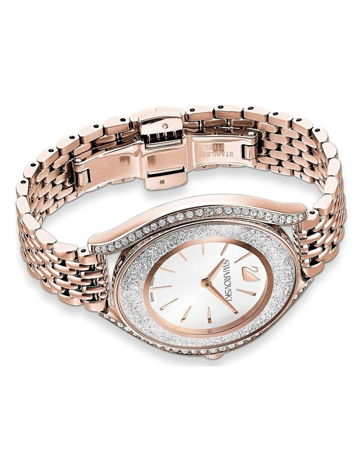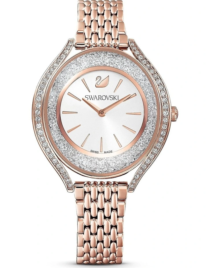 Eminently elegant: This Swarovski watch from our Crystalline Aura Collection artfully combines form and function. More than 1,300 crystals in the rose-gold tone PVD case create a brilliant sparkling effect. A rose-gold tone PVD bracelet and a white silver tone dial with the Swarovski swan at 12 o’clock complete the sophisticated design. This Swiss made watch is water resistant up to 50 m.
