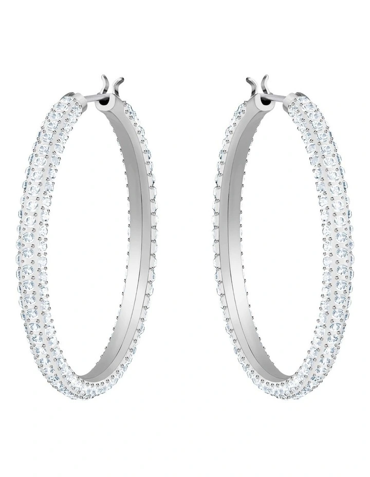 Find the perfect gift for Mothers Day or any other occasion with this timeless pair of hoops, decorated with crystal pav for that special Swarovski sparkle. The delicate, rhodium-plated design is easy to wear with any outfit, from day to evening.