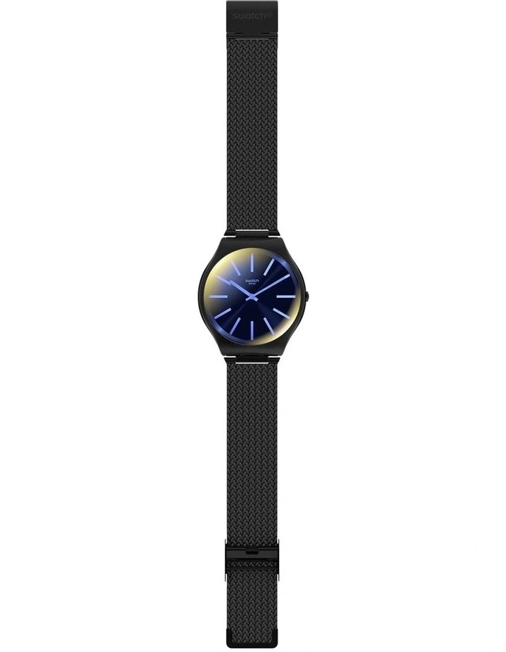 This 42 mm, ultra-thin watch features a brushed, stainless-steel case and stainless-steel Milanese mesh bracelet with a black PVD coating. The Solar Spectrum glass exalts the sun-brushed black face, making the hour markers look almost fluorescent, for an elegant slim watch.