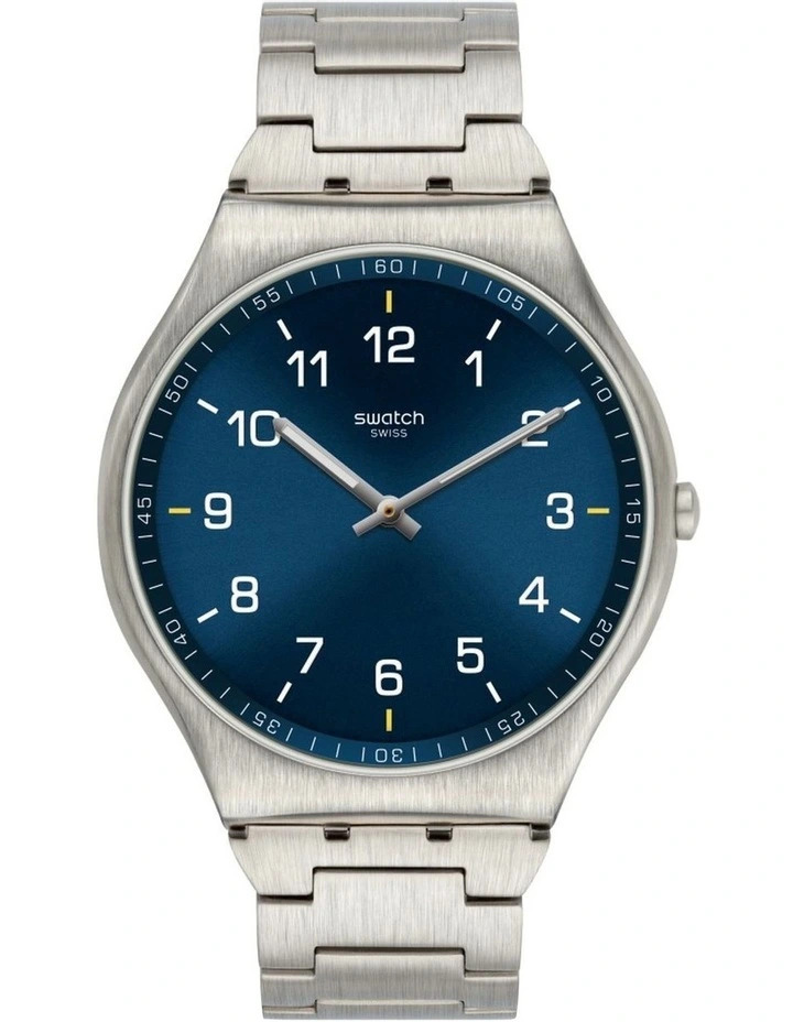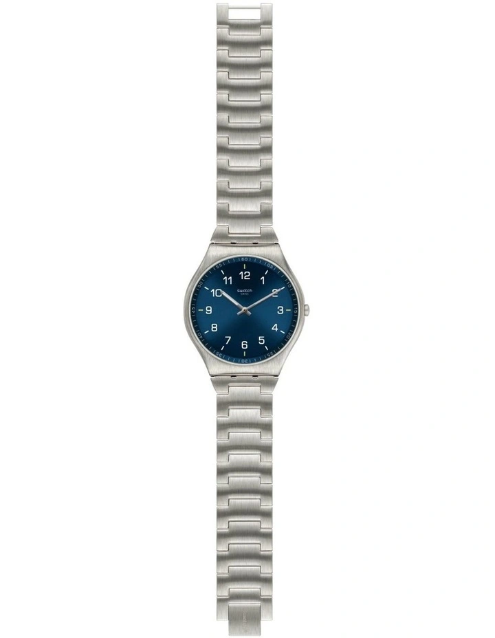 Super thin SKIN SUIT BLUE (SS07S106G) features a slim brushed metal bracelet and matching case. The sun-brushed blue dial has silvery hands coated in Swatch Glow. Swiss Made Quartz movement.