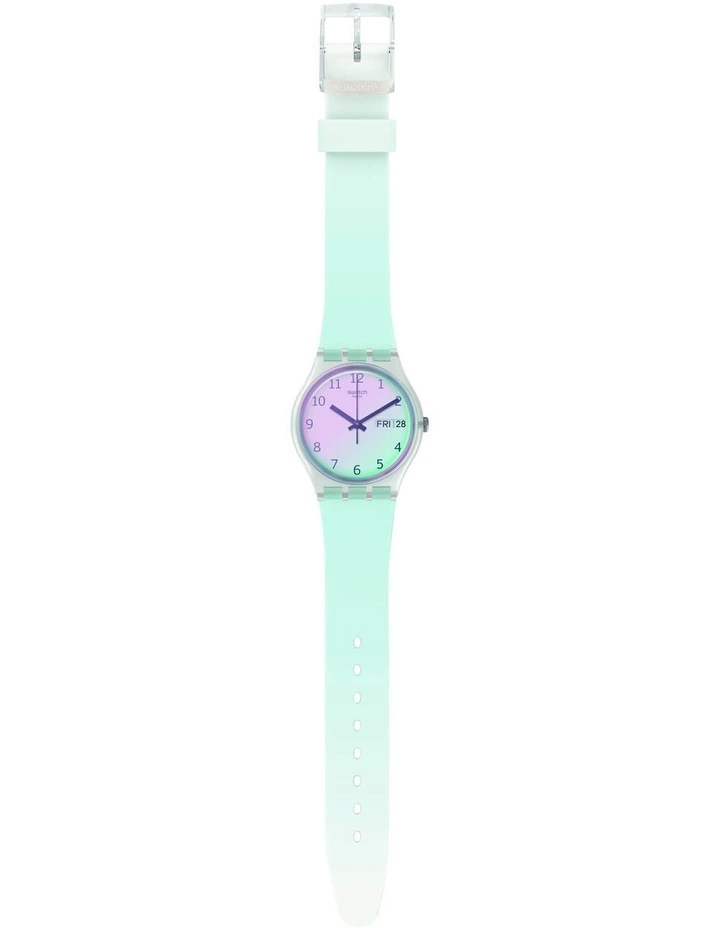 Sky blue ULTRACIEL (GE713) blows the clouds away. The light blue strap goes perfectly with the white dial, which is covered by a light blue Swatch Solar Spectrum glass. Swiss Made Quartz movement.