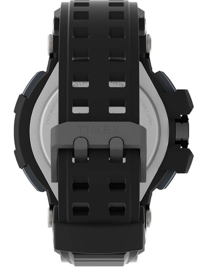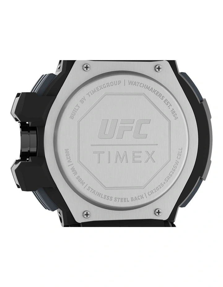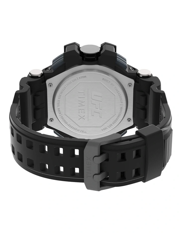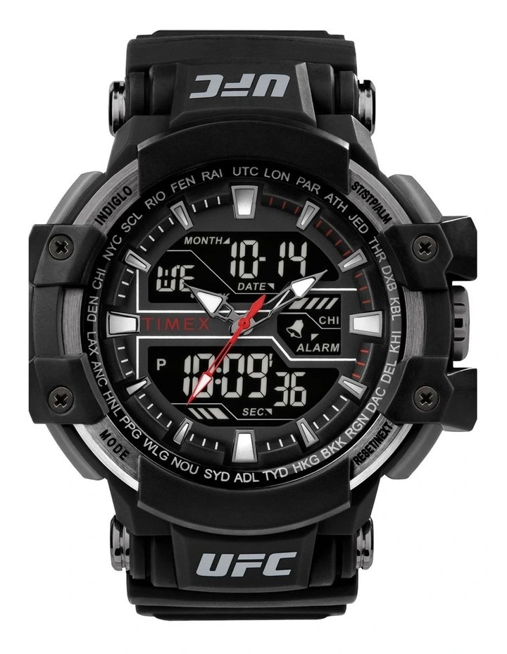 The TIMEX UFC Combat is an analog-digital powerhouse expertly engineered to keep up with your active lifestyle. Its feature set includes a 24-hour chronograph with 1/100-second resolution, 24-hour military time, dual time zones, calendar, and daily alarm/alert system. Construction-wise, this watch is as tough as they come thanks to the rugged 53mm black case design, scratch-resistant lens, and black resin straps for lasting durability. Bold, resilient, and alight with confidence, our revolutionary INDIGLO backlight technology goes head-to-head with an impressive water resistance rating of 50m, so you can finish the challenge, no matter the conditions.