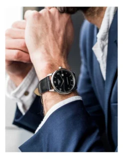 A womens Swiss-made quartz watch with scratch-resistant sapphire crystal, black dial and stainless steel bracelet.