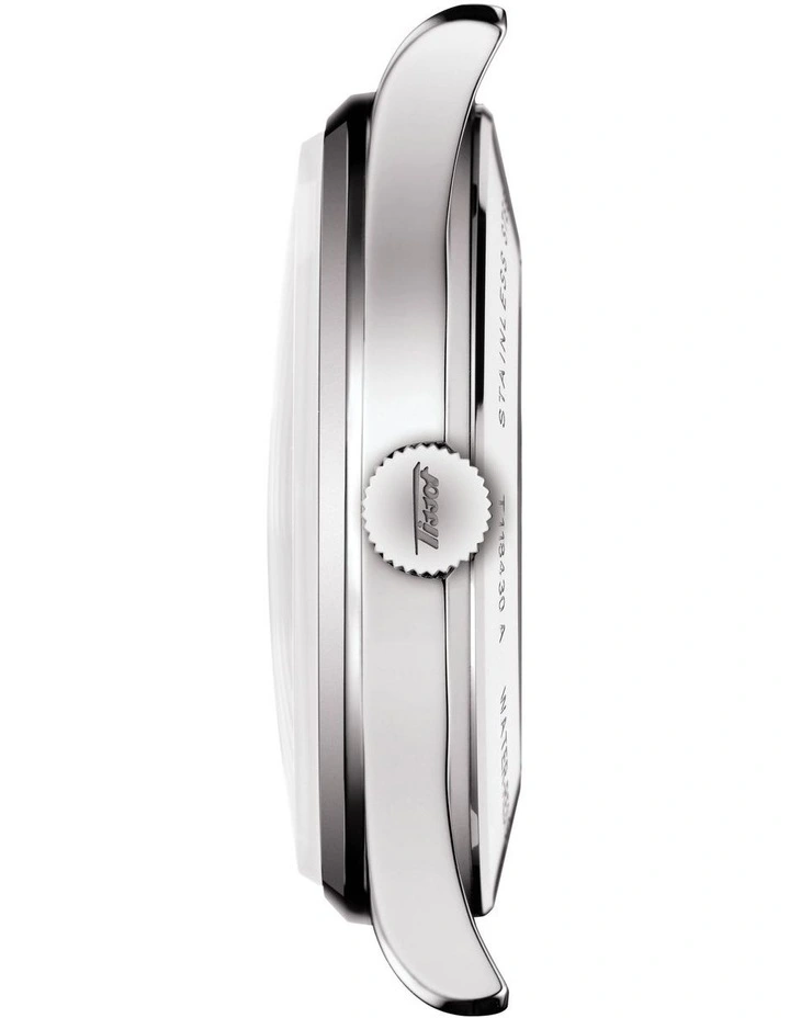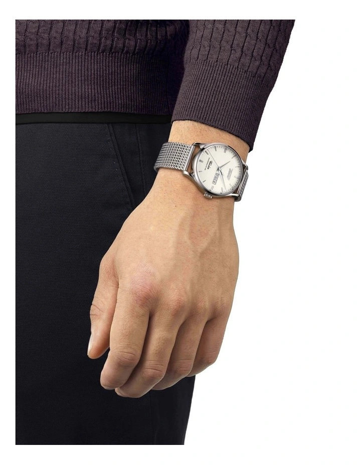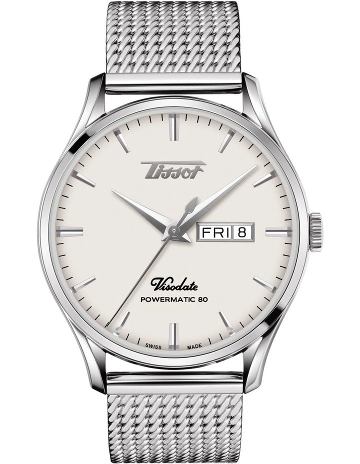 The Heritage Visodate Powermatic 80 collection celebrates Tissot’s rich history and combines nostalgia with contemporary details. This men’s Swiss-made watch features a gently curved silver dial and domed scratch-resistant sapphire crystal to clearly show the day and date, and complemented by a stainless steel strap. With a power reserve up to 80 hours and Nivachron balance spring with non-magnetic capabilities.
