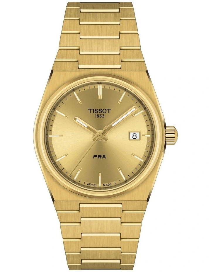 Tissot welcomes new smaller models to its PRX lineup with its PRX 35mm. A throwback 1978 design with its slim look and integrated case and bracelet. Perfect for men and women with an eye for style, this Swiss-made watch has a scratch-resistant sapphire crystal, champagne dial and satin-finish stainless steel bracelet.