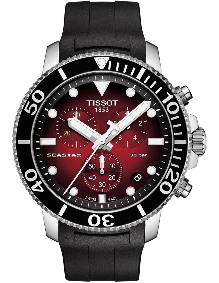 The Tissot Seastar 1000 Chronograph watch features a high water-resistance up to an impressive pressure of 30 bar (300m/1000 ft), screw-down crown and case-back, screw-down pushers and unidirectional steel bezel with aluminium ring.