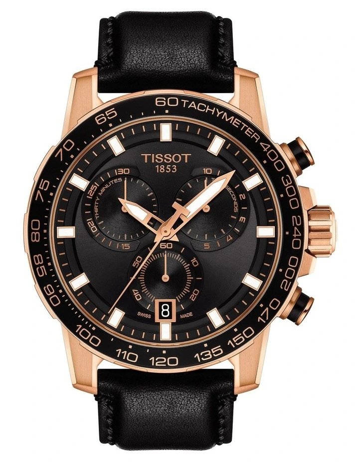 With a bold design, large 45.5mm case and chronograph functions, the Supersport Chrono makes an impressive addition to the Tissot collection. This mens Swiss-made watch has a scratch-resistant sapphire crystal, aluminium bezel ring, black dial and black vintage hand-stitched leather strap.