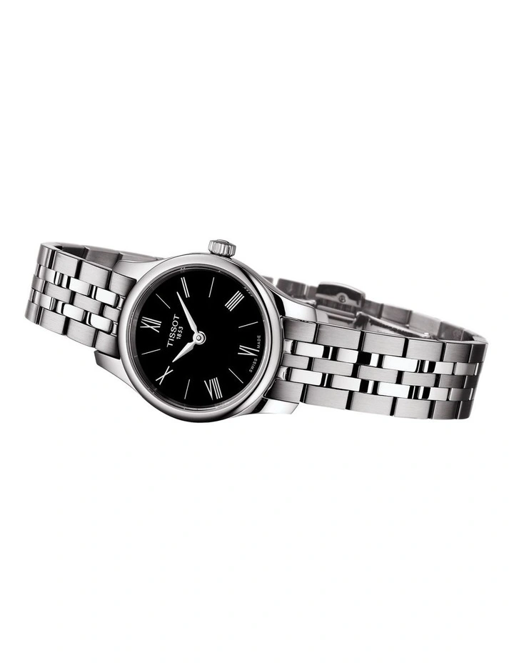 A women’s Swiss-made watch with scratch-resistant sapphire crystal, black dial with Roman numeral and index indices, and stainless steel bracelet.